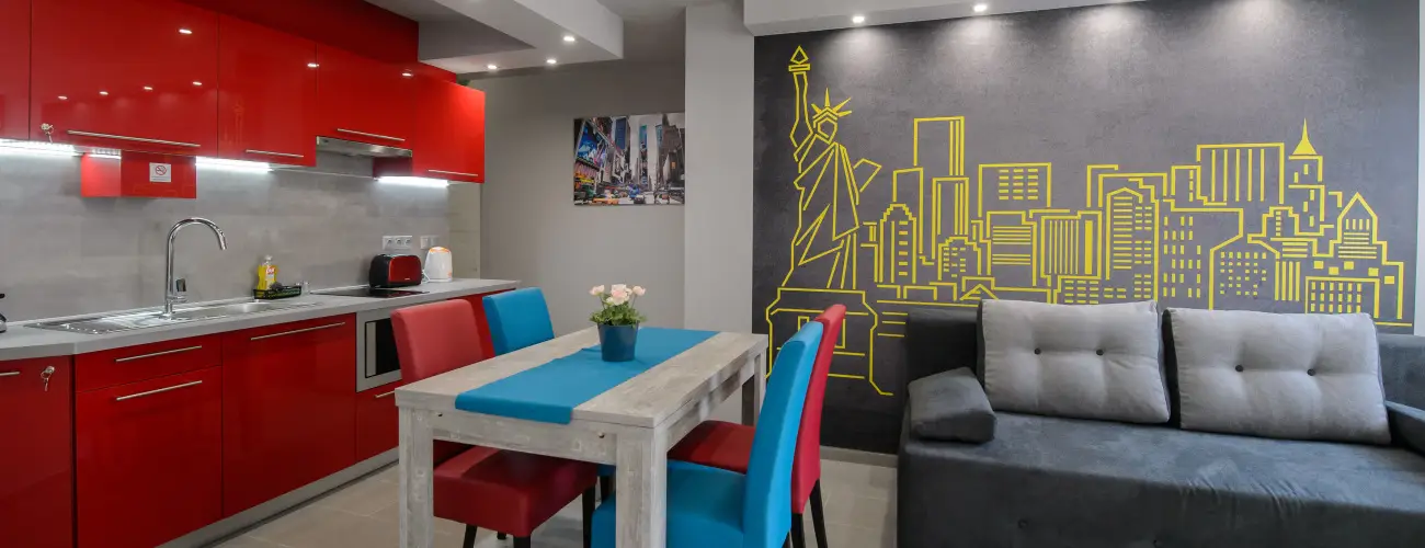 Az apartmanok tematikáját világvárosok ihlették, melyek fantázia nevei New York, London, Paris, Budapest és az Art Legends, hűen tükrözve az apartmanok hangulatát. Légkondicionálóval, Wi-Fi-vel, TV-vel, étkezősarokkal, teljesen felszerelt konyhával, hajszárítóval ellátott, saját fürdőszobával rendelkeznek. A fiatalos, tágas apartmanokban mikrohullámú sütő, hűtőszekrény, tűzhely és vízforraló szintén biztosított. Kellemes, nyugodt környezetben, 3 emeleten elhelyezkedő apartmanok közül városra, sétálóutcára néző kilátással, tökéletes lehetőséget nyújt mind a pihenésre, kikapcsolódásra vágyóknak, családoknak, pároknak, mind pedig az üzleti útra érkezőknek, minden igényt kielégítve.